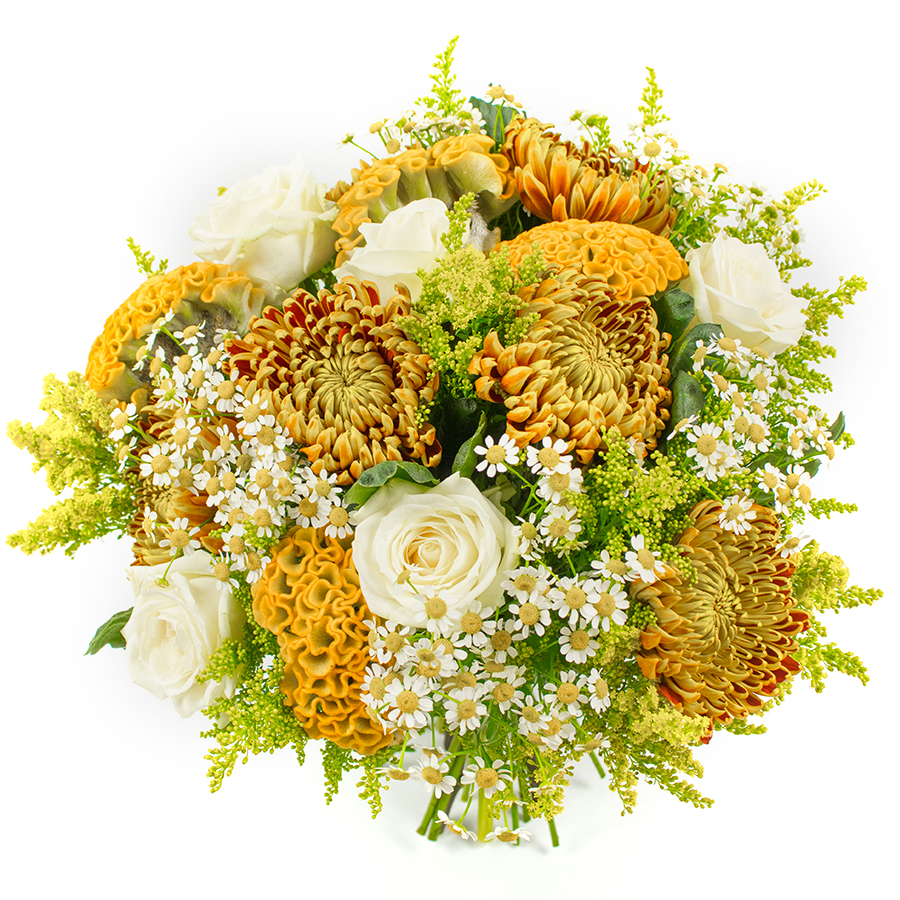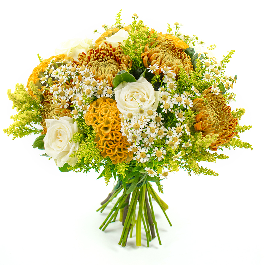 As cozy as a countryside cottage, this rich colour mix of roses, chrysanthemums, chamomile and greenery will spread the captivating beauty of the autumn season right inside your home.