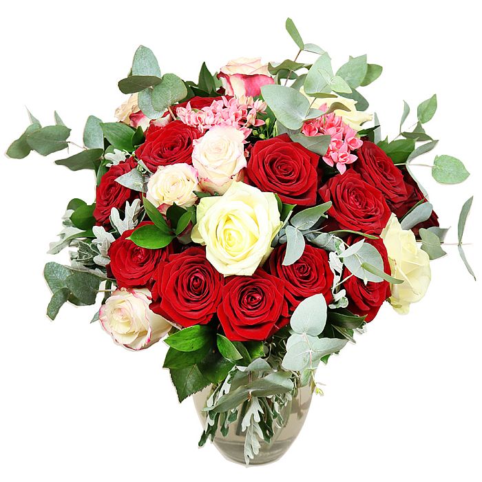 Experience the perfect harmony of vibrant red and white roses paired with the crisp aroma of eucalyptus and the delicate beauty of bouvardia. Each flower is hand-picked for its impeccable quality and delivered in a budding state so you can enjoy the unfolding of their natural beauty.